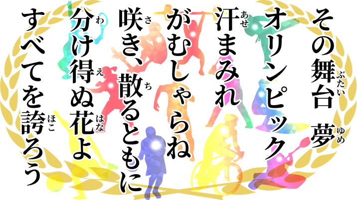 - そのぶたいゆめ おりんぴっく あせまみれ がむしゃらね さきちるともに わけえぬはなよ すべてをほころう