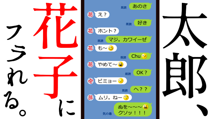 太郎、花子にフラれる。あのさ/え?/好き/ホント?/マジ。カワイーぜ/も~/チュ/やめて~/OK?/ビミョー/へ??/ムリ。ねー/ぬを~~~、クソッ!!!